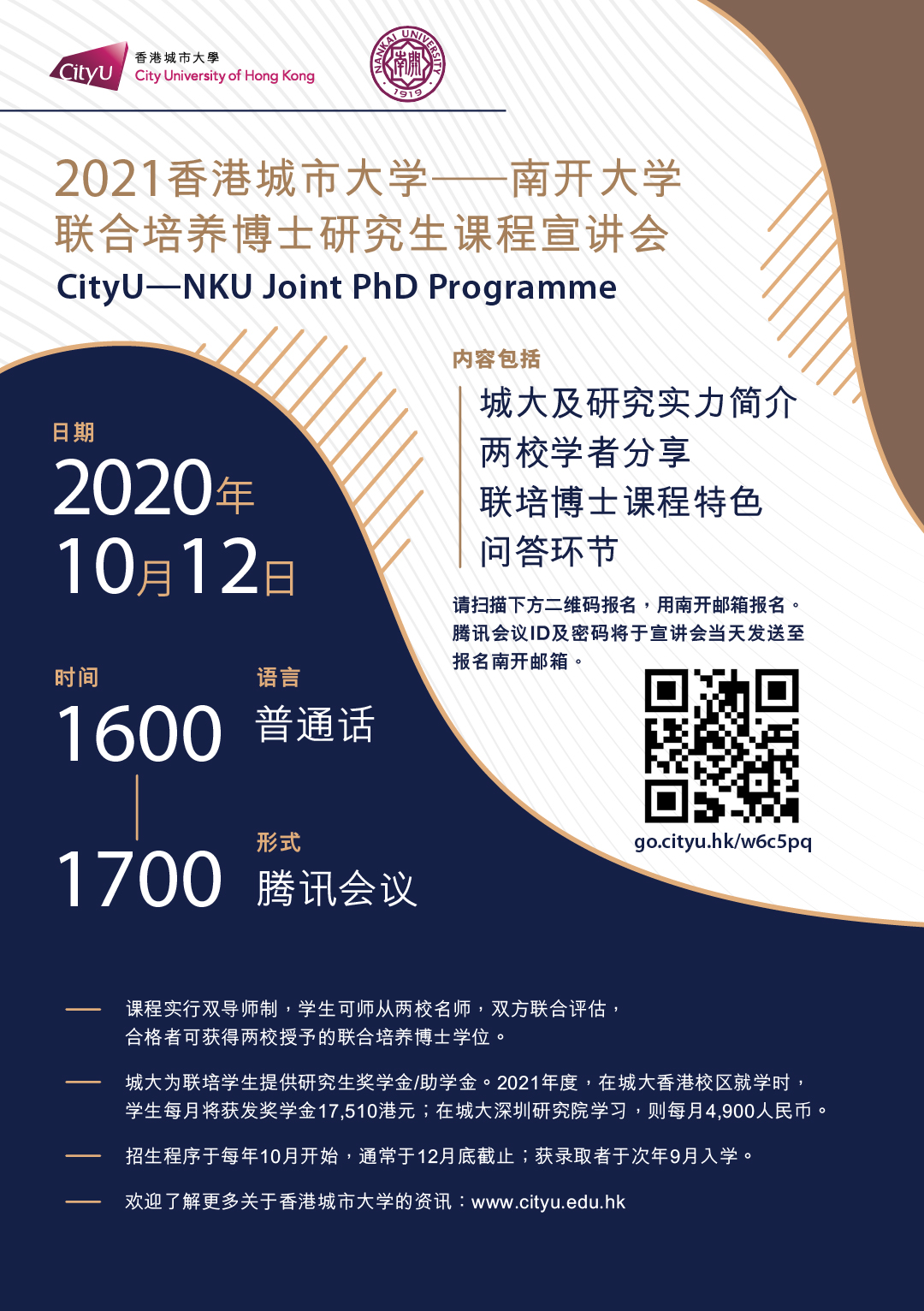 我校如上专业招收的全日制非定向博士研究生。原则上学生先在南开修读并完成公共必修课和学科基础课程,进入项目后按以下学习模式分别在南开、城大及城大深圳研究院三地,修读部分专业课及完成学位论文。具体学制安排如下: